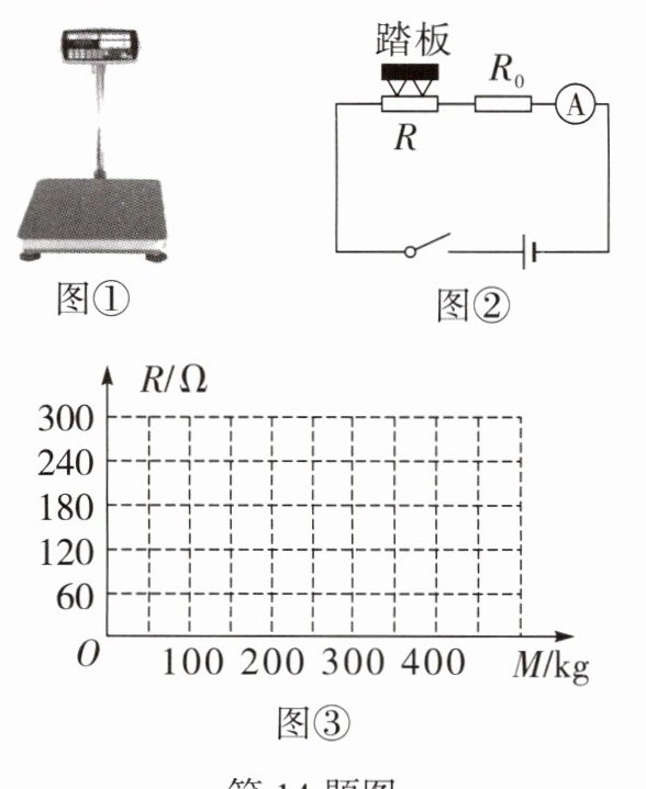14. (项目式学习 · 探究电子秤工作原理)某物理兴趣小组打算研究电子秤的工作原理,如图①是某种电子秤,图②是该电子秤工作电路图,当重物在踏板上时,电阻$R$改变,进而改变电流表的读数,对于不同的电流表读数,电源两边电压固定,通过电流表读数与电压可计算出电阻,进而可得到重物的质量,该小组得到的电阻$R$(单位:$\Omega$)与重物质量$M$(单位:$kg$)的数据如下表,请根据相关信息回答下列问题。