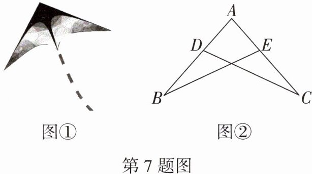 7. 日常生活情境 燕尾形风筝 小明准备制作如图①所示的燕尾形风筝骨架,如图②所示,他先将两根长度相同的竹条AB,AC扎在一起,再用竹条BE,CD进行固定,并使得$∠BDC= ∠CEB$,这样能保证$\triangle ABE\cong \triangle ACD$吗? 请说明理由.
