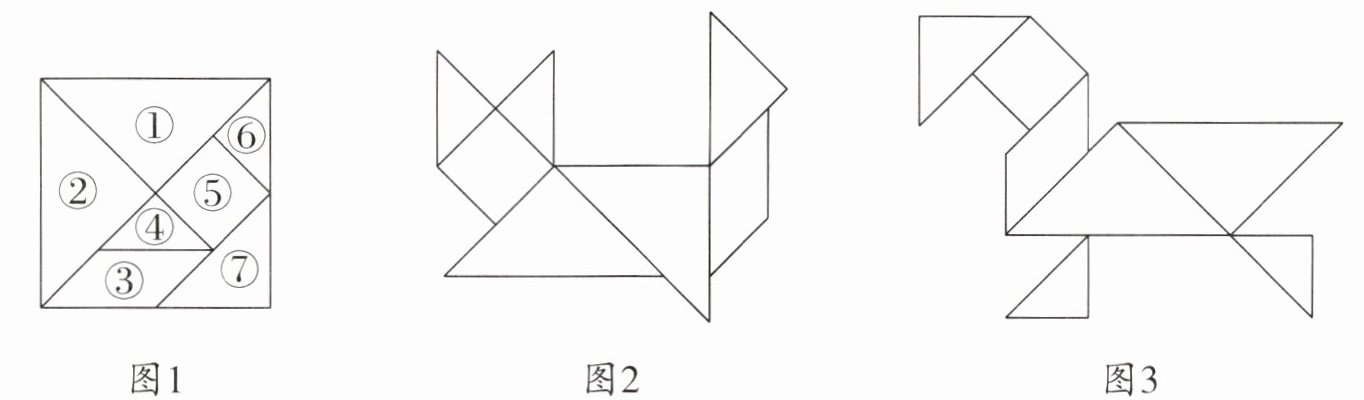 1. 图1中的七巧板由( )种图形组成,其中( )号图形是正方形,( )号图形是三角形,( )号图形是平行四边形。