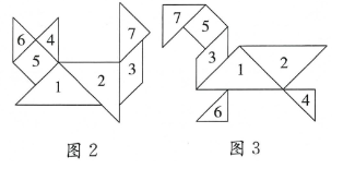 3. 图2和图3中的图案分别是由图1中七巧板上的几号图形拼成的?请在图中标出来。