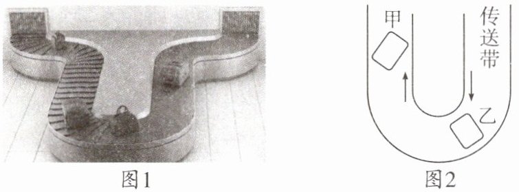 11. 图 1 是机场内正在匀速运行的传送带, 图 2 是其俯视示意图。某时刻行李箱甲、乙运动到如图 2 所示的位置, 下列说法正确的是(