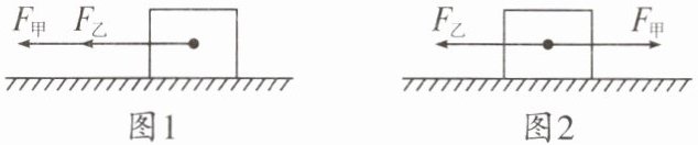 13. 有甲、乙两同学分别用 $ F_{甲} = 50 \, \text{N} $、$ F_{乙} = 40 \, \text{N} $ 的力水平向左推某一物体, 使物体水平向左做匀速直线运动, 如图 1 所示, 则物体受到的摩擦力 $ F_{f} = $