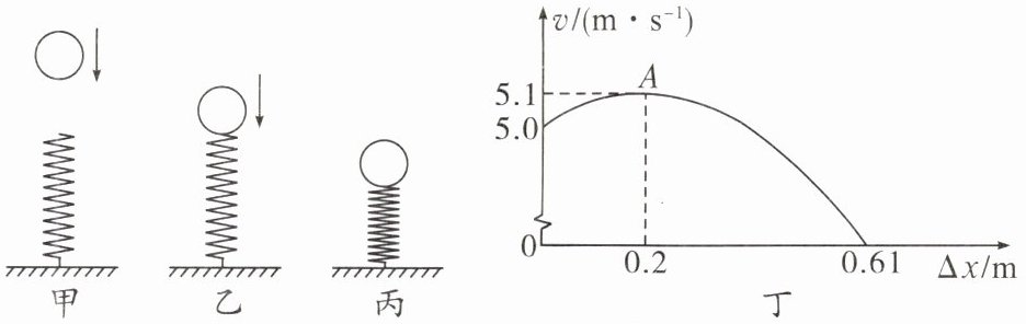 10. 小明在老师的指导下用金属球和弹簧等器材进行了如下实验与探究(不考虑空气阻力):让金属球从某高度处由静止开始下落到竖直放置的弹簧上(如图甲),在刚接触弹簧的瞬间(如图乙),金属球速度为5.0m/s。从金属球接触弹簧到将弹簧压缩至最短(如图丙)的整个过程中,得到金属球的速度$v和弹簧缩短的长度\Delta x$之间的关系如图丁所示,其中A为曲线的最高点。已知该弹簧每受到0.1N的压力就缩短0.5cm,并且弹簧在全过程中始终发生弹性形变。(弹簧质量忽略不计)