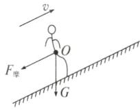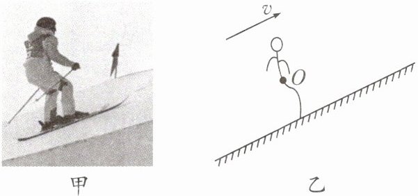 1. 如图所示,图甲是某运动员沿冰雪赛道向上滑行的某一情境。请在此情境的示意图乙中以O点为力的作用点,画出运动员受到的重力和此时赛道对运动员产生的摩擦力$F_{摩}$的示意图。