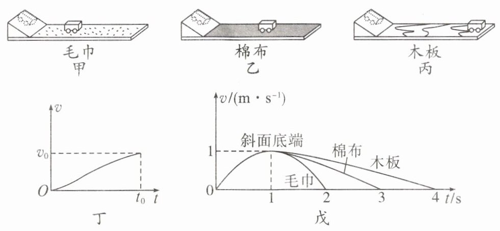 (2)经过实验,小车运动的$v-t$图像如图戊所示,小车在棉布上速度每秒减少___m。由图可知:在水平面运动的过程中,小车所受阻力越小,减速越___(选填“快”或“慢”)。