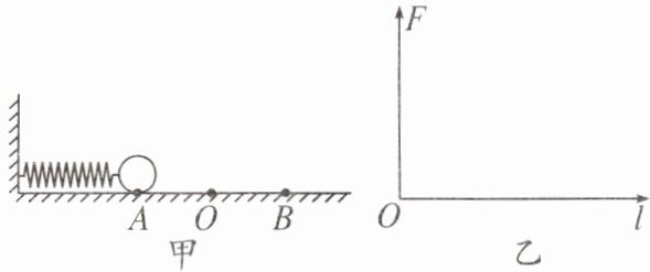 7. 如图甲所示,在粗糙程度相同的水平台面上,将一轻质弹簧左端固定,右端连接一金属小球,O点是弹簧保持原长时小球的位置。开始时通过小球压缩弹簧到A位置(已知$AO= OB$),释放小球,请在图乙中画出小球从开始释放至移动至最右端所受的合力大小随移动距离的大致变化图像(不计空气阻力)。