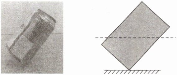 6. 平衡大师将装有适量水的易拉罐斜立在水平桌面上,如图所示。若易拉罐的重心在简图的虚线上,请你在其简图中作出易拉罐的受力示意图。