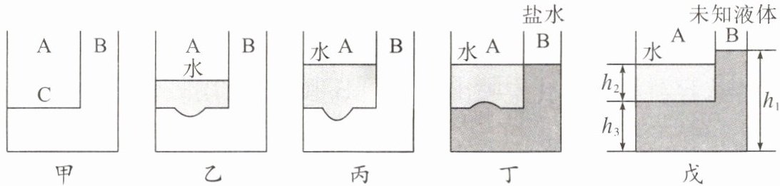越大,液体压强越大。(3)小明还利用薄壁实验箱测量出某未知液体的密度,如图戊所示,在A箱中加入水,在B箱中加入某未知液体,使橡皮膜变平,用刻度尺测得此时$h_1= 22cm$,$h_2= 9cm$,$h_3= 12cm$,则未知液体的密度为