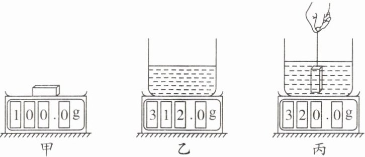 8. 小明同学将一块金属块放在电子台秤上,台秤示数如图甲,再将盛水的一次性杯子放在电子台秤上,台秤示数如图乙,紧接着他用细线(体积忽略不计)绑住金属块。然后用手提着金属块放入一次性水杯中,让金属块完全浸没但不触底,台秤示数如图丙,整个过程水始终未溢出。金属块完全浸没时受到的浮力为______