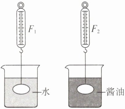 7. (多选)把重为 G 的石块挂在弹簧测力计下,将石块分别浸没在水和酱油中(两种液体密度不相等),石块没有碰到容器的底部和侧壁,测力计的示数分别为 $ F_{1} $ 和 $ F_{2} $,已知水的密度为 $ \rho_{水} $。下列说法正确的是(
