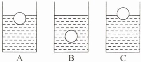 1. 将完全相同的三个小球同时放入三种不同的液体中,它们静止时的情况如图 A、B、C 所示,由此可知,小球在三种液体中受浮力$F_{A}$、$F_{B}$、$F_{C}$的大小关系是(