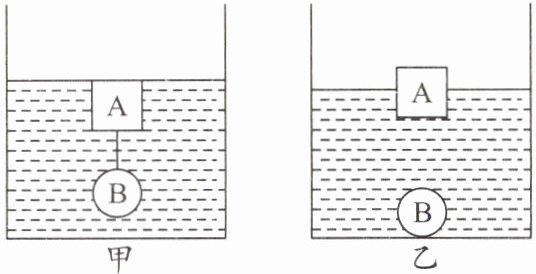 7. 棱长是 10 cm 的正方体木块 A 和金属球 B 用细线连接后刚好悬浮在水中,如图甲所示;把细线剪断,待 A 和 B 静止后,木块 A 漂浮在水面上,露出水面的高度是 4 cm,金属球 B 沉底,如图乙所示,已知木块 A 和金属球 B 的体积相等。求:
