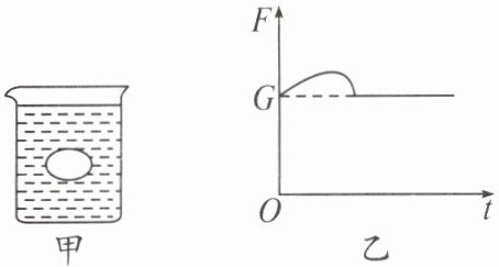 6. 一枚重为 G 的鸡蛋恰好悬浮在水中,如图甲所示。如果向水中均匀缓慢地加盐或酒精,鸡蛋所受浮力就会发生相应的变化,根据图乙中鸡蛋所受浮力 F 随时间 t 变化的图像可以判断,向水中加入的是