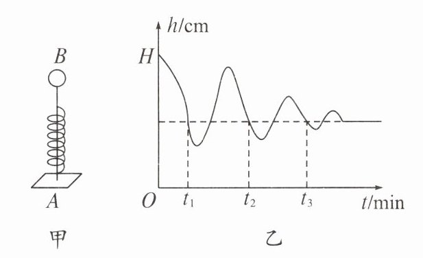 能。小萌记录小球的高度随时间变化的情况如图乙所示。在整个过程中,小球在 $ t_{1} $、$ t_{2} $、$ t_{3} $ 时刻的动能最大的是$ t_{1} $