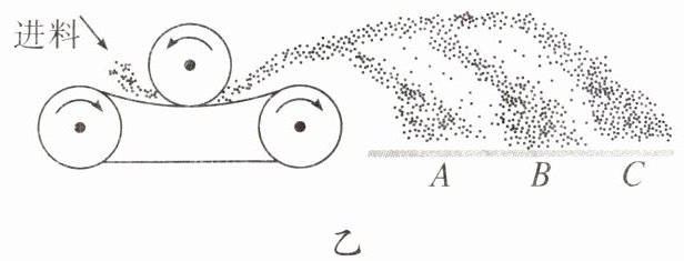 如图乙所示,将少量碎石、谷粒及糠皮的混合物从农用扬场机进料口倒入,在快速转动的轮子和皮带的带动下三者被抛出落地形成了A、B、C三堆,达到分离的目的,其中落在最远处C点的是