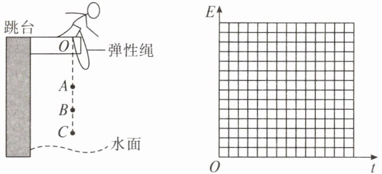 9. 如图所示为蹦极运动的简化示意图,弹性绳一端系在运动员双脚上,另一端固定在跳台 O 点,运动员由静止开始自由下落,A 点处弹性绳正好处于原长;B 点处运动员受到的重力与弹性绳对运动员的拉力大小相等,此时速度最大;C 点处是蹦极运动员到达的最低点(整个过程忽略空气阻力,弹性绳的自重不计)。请在坐标系中画出从 A 点到 C 点的过程中,运动员的动能 E 随时间 t 变化关系的大致图像。