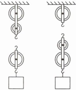 7. 小李打扫卫生时需要将一个重物搬离地面,由于力气太小无法搬动,聪明的他想到了滑轮组可以省力,于是他找来家里的 2 个滑轮组,请你帮他选择其中一个滑轮组用来提升重物以达到最省力的目的(绳子需要绕过每一个滑轮,忽略动滑轮重力)。