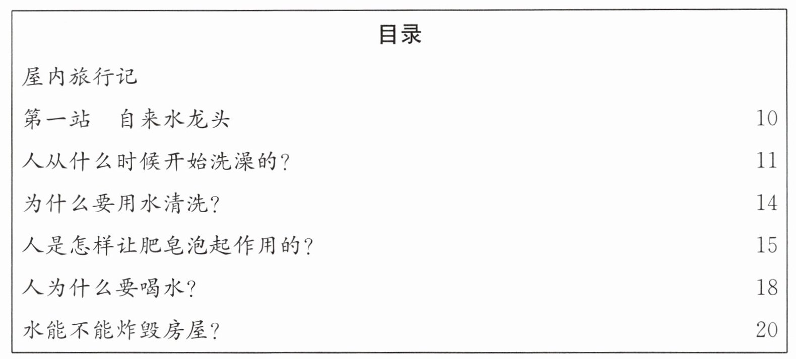 (2)元元看到妈妈把沾满灰尘的衣服拿到水龙头下冲洗,不一会儿灰尘就被水冲走了。她想知道人们为什么要用水清洗脏的东西,应该翻到这本书的第______