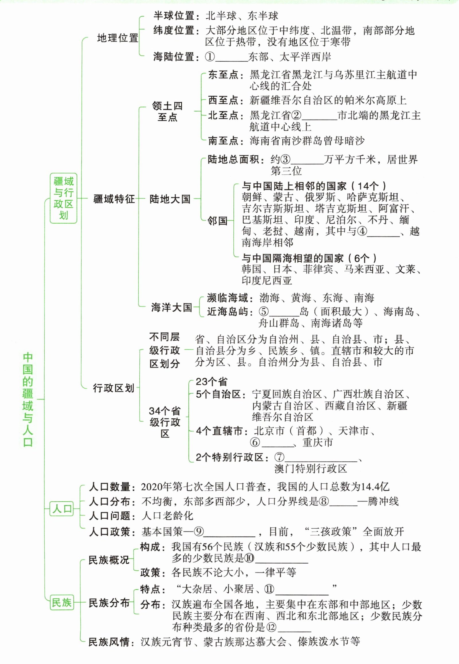 ①亚洲 ②漠河 ③960 ④朝鲜 ⑤台湾 ⑥上海市 ⑦香港特别行政区 ⑧黑河 ⑨计划生育 ⑩壮族 ⑪交错杂居 ⑫云南省