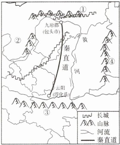 (跨历史·史实)秦直道始建于公元前212年,它南起云阳(现淳化县),北达九原郡(现包头市),全长700余千米。读秦直道示意图,完成5~6题。