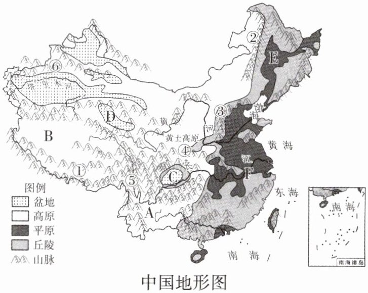 (2)A 云贵高原 B 青藏高原 C 四川盆地 D 柴达木盆地 E 东北平原 F 长江中下游平原