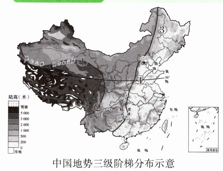 1. 填图:填出图中圈码代表的地势阶梯分界线上的山脉名称。