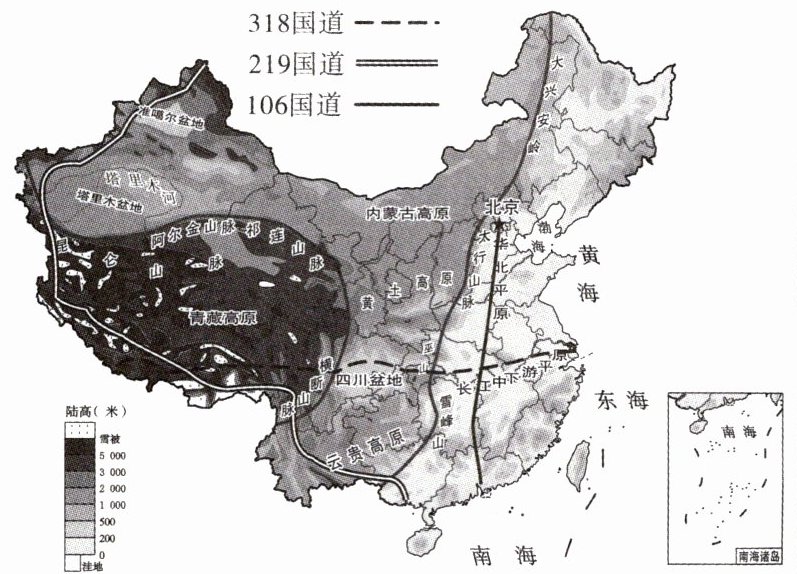 (3)国道沿线跨越我国地势三级阶梯,经过平原、丘陵、盆地、高原等多种地形,地形类型复杂多样;沿线地势落差巨大,造就沿线自然景观变化丰富。(2分)