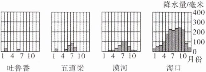“共享”已经成为经济的新名词,某公司推出的“共享雨伞”在全国进行投放。读我国部分城市降水量柱状图,完成4~5题。