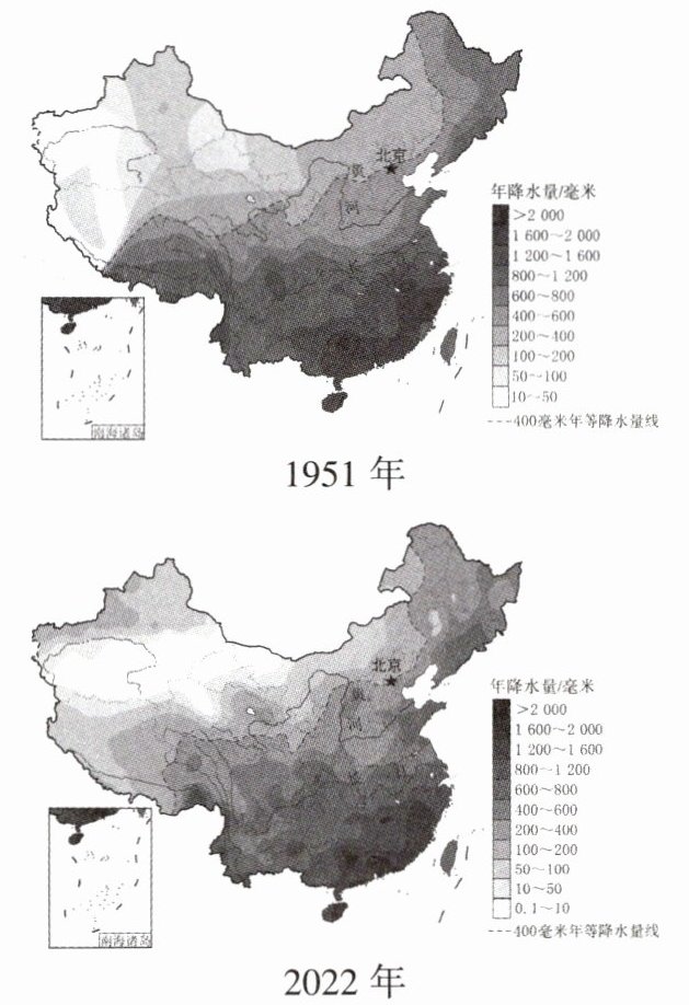 400毫米年等降水量线是见证雨水多寡的气候界线。中国天气网通过对比1951年与2022年的降水数据,展现我国降水的变与不变。读1951年及2022年我国降水分布情况,完成1~3题。