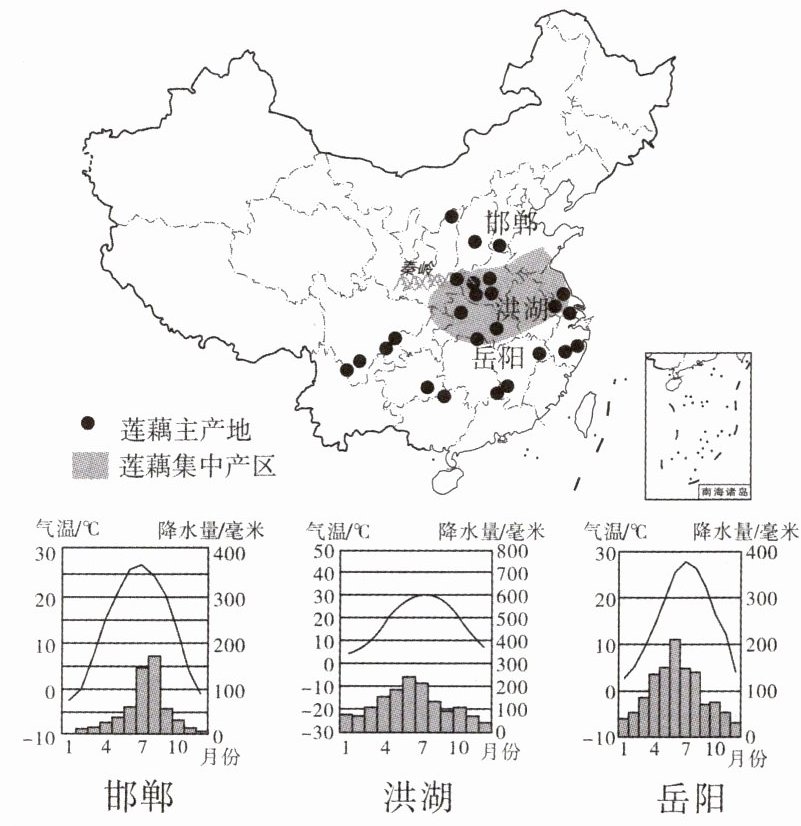 世界80%的莲藕产自我国,河北邯郸、湖北洪湖、湖南岳阳均是我国的莲藕主产地。莲藕春、夏、秋、冬季分别处在萌芽期、莲子采收期、结藕期、挖藕期。读我国莲藕产地分布图及气候资料图,完成9~10题。