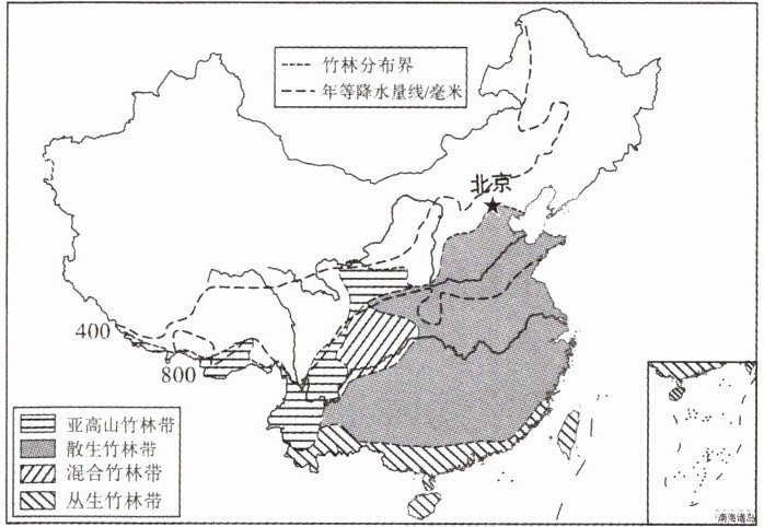 11. 竹类喜温暖湿润的气候,对气候环境要求高。散生竹类的适应性强于丛生竹类,对干旱和寒冷气候条件有较强的适应能力。读我国竹林带分布图,完成下列问题。(8分)