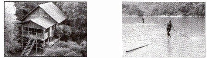 ①我国西南地区气候潮湿,降水丰富,竹楼的屋顶坡度较大,排水便利,底部高脚的设计不与地面接触,从而达到防潮的目的。当地盛产竹类,便于就地取材。或②独竹漂流行地区位于贵州省,贵州省地处高原,地形复杂,地表起伏较大,交通不便;地处湿润地区,降水丰富,河流众多,利于竹子生长,便于人们出行时作为交通工具。