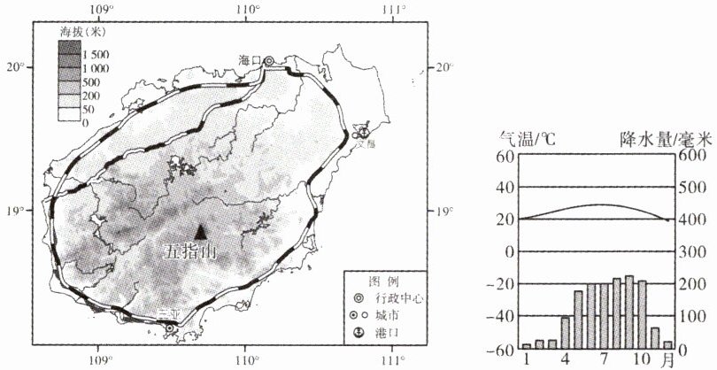 海南大叶茶主要分布在五指山地区,属于雨林大叶茶,每年11月底就开始采摘,采摘时间比我国内陆地区早了近3个月。读海南岛地形图及五指山气候资料图,完成6~7题。