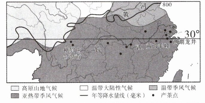 我国茶树种植历史悠久,其中30°N附近有一条“黄金产茶带”,中国十大名茶中有九种都分布在这一纬度附近。读黄金产茶带示意图,完成4~5题。