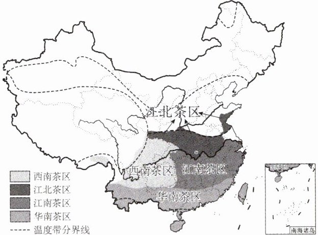 (教材图改编)中国是茶的故乡,各区域内独特的环境衍生出独特的茶树品类,所生产的绿茶、白茶、黄茶、红茶等各具风味。读我国四大茶区分布图,完成1~3题。