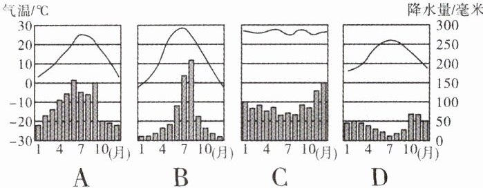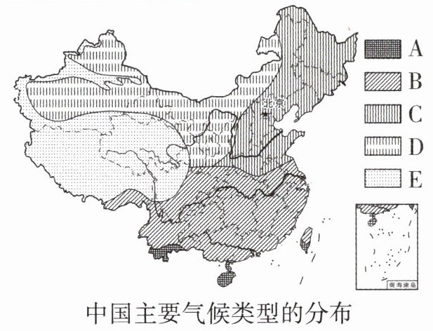 A 热带季风气候 B 亚热带季风气候 C 温带季风气候 D 温带大陆性气候 E 高原山地气候