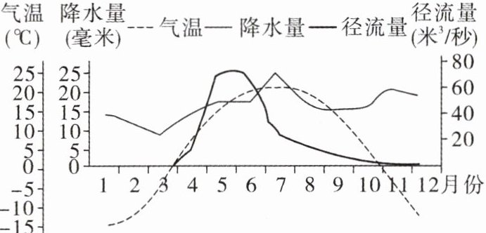 额尔齐斯河发源于植被丰富的阿尔泰山脉西南坡,是我国西北内陆地区唯一注入北冰洋的河流。读额尔齐斯河平均气温、降水量、径流量年内变化示意图,完成6~7题。
