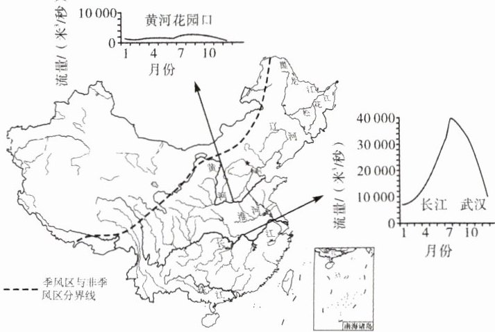 2024年11—12月,黄河部分流域已经封冻,而此时长江大部分流域却无封冻,且出现水位较历史同期下降现象。读我国河流分布及黄河、长江年径流量示意图,完成3~5题。