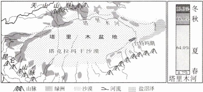 10. (中考新题型·主题探究)(教材阅读改编)塔里木河是我国最长的内流河,自高山发源,最终消失于沙漠。读塔里木河位置及其流量季节分配示意图,完成下列问题。(9分)