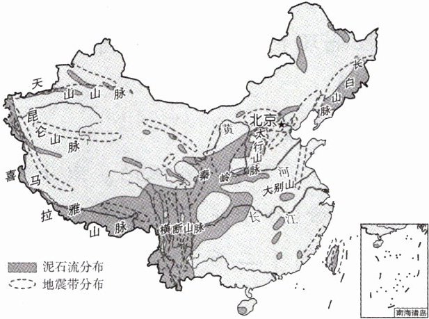 我国是世界上自然灾害发生最为频繁的国家之一。读我国泥石流灾害分布图,完成1~2题。