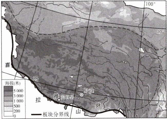 (2)地形:位于青藏高原地形区,地形、地质条件复杂。气候:此时正值冬季,加之海拔高,气温较低。交通:位于偏远地区,交通基础设施不完善,交通不便。(任答两点,2分)