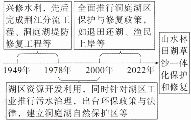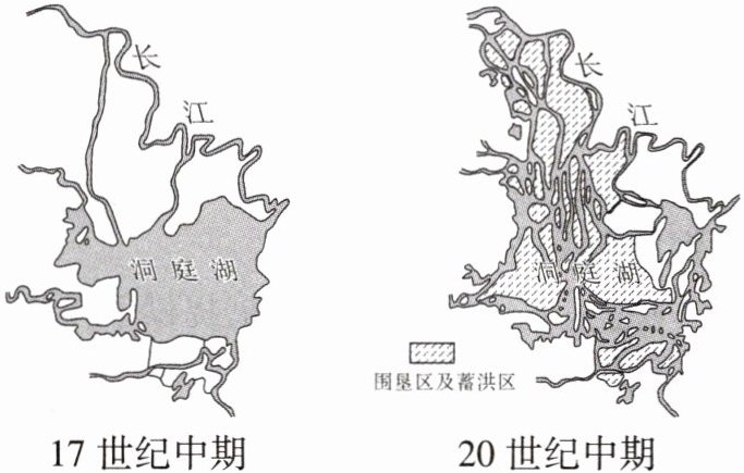 3. D 4. D 【解析】本题考查洞庭湖湖区可持续发展受限的人为原因。结合材料及所学可知,降水多,洪涝多发属于自然原因;由于洞庭湖湖区人口增长和经济发展,过度的开发、围湖造田和环境污染,导致湖区面积缩小、萎缩,调蓄能力减弱;湖水污染和过度捕捞使水生生物减少,可持续发展受限。
