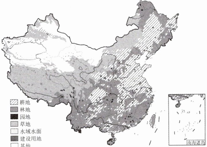 我国土地资源类型齐全,拥有耕地、林地、草地等多种土地利用类型,有利于对土地进行多样化的开发利用。读中国土地利用类型分布图,完成 3~5 题。