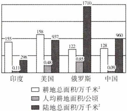 (教材活动改编)土地是人类赖以生存的基本自然资源。读中国与其他国家陆地、耕地总面积以及人均耕地面积比较(2020 年)和我国土地类型构成图,完成 1~2 题。