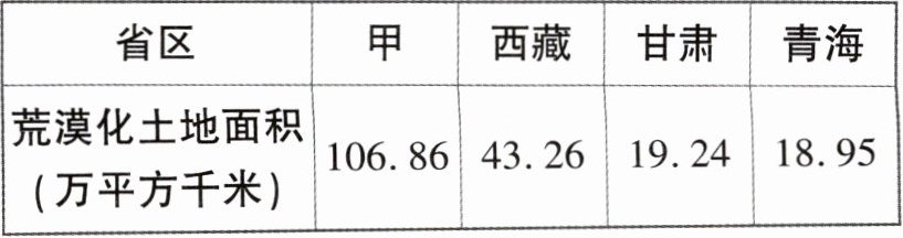2024 年 6 月 17 日是第 30 个世界防治荒漠化与干旱日,中国在世界范围内率先实现了土地退化“零增长”、荒漠化土地和沙化土地面积“双缩减”。下表为部分省区荒漠化土地面积统计表。据此,完成 8~10 题。