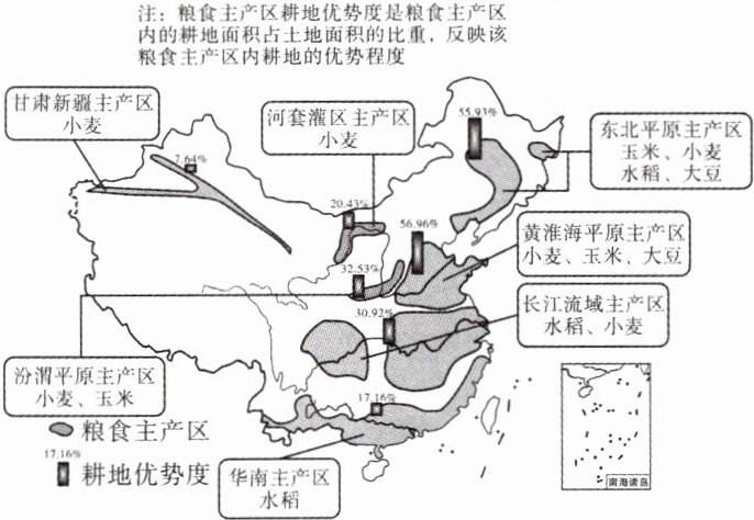 耕地优势度是用来衡量一个地区耕地资源的质量和价值的重要指标。读我国粮食主产区耕地优势度分布图,完成 6~7 题。