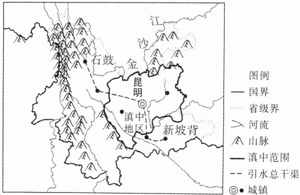 滇中地区是云南经济、社会发展的核心区,用水量大。滇中引水工程起点位于云南省玉龙纳西族自治县石鼓镇,终点为红河哈尼族彝族自治州新坡背,其中引水隧洞611千米,通过筑千里水脉,解云南之“渴”。读滇中引水工程线路图,完成3~5题。