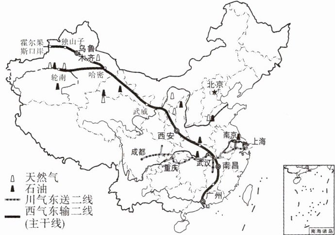 (定心卷改编)川气东送二线工程气源地位于四川达州普光气田,该线与西气东输管道系统联通,在我国内陆腹地构筑起一条东西向的能源大动脉。读天然气运输线路示意图,完成1~2题。