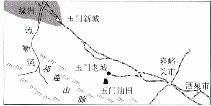 玉门位于河西走廊西部,玉门油田开发于 1939 年,是我国石油工业的摇篮。1957 年,中华人民共和国第一个石油化工基地在玉门建成。玉门的石油工业为中华人民共和国建设、发展作出了不可磨灭的贡献。读玉门位置示意图,完成 3~5 题。