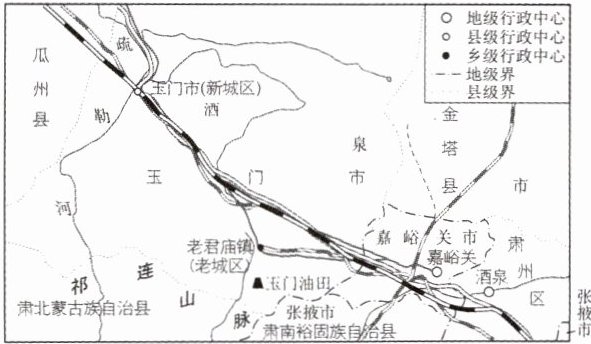 20 世纪 80 年代初,玉门人口曾达 13 万人。随着石油资源的枯竭,2002 年,玉门开始将学校、医院等机构搬迁至酒泉市,玉门市政府搬迁至玉门市新城区,玉门的人口和城市功能逐渐分散。读玉门新城和老城位置示意图,完成 6~8 题。